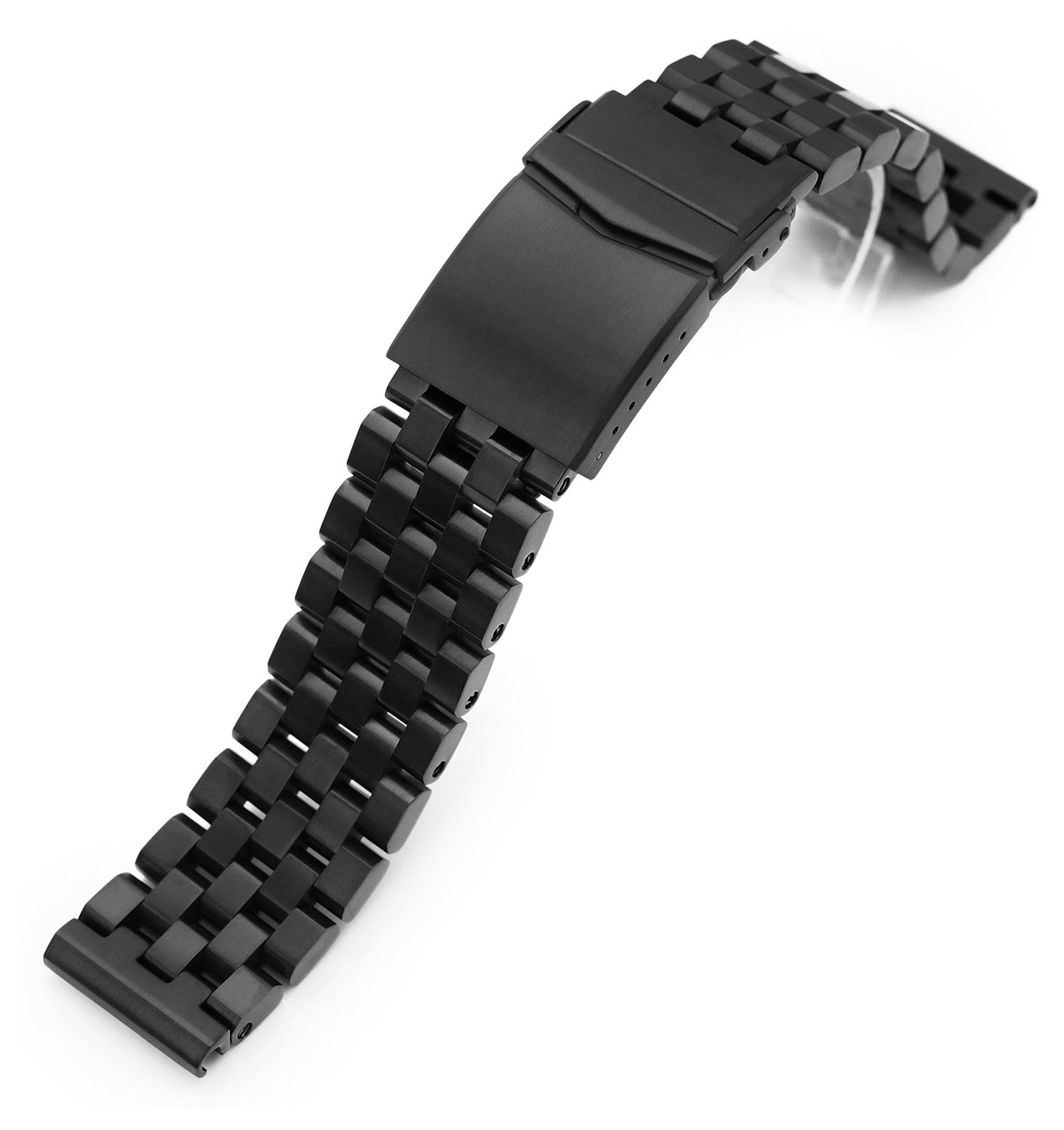 MiLTAT Super Engineer II Straight End 22 mm SS222220BLC024 teräsrannekkeen avulla päivität kätevästi nykyisen kellosi ilmettä. 316L-kirurginteräksestä valmistettu ranneke sopii kaikkiin tavallisimpiin 22 mm lugivälin omaaviin kelloihin, ja pituutta on helppo säätää lukon kuuden säätöreiän ansiosta. Rannekkeen pinta on DLC-pinnoitettu. Rannekkeen mukana toimitetaan 2 kpl 2,5 mm jousinastoja, jotka takaavat turvallisen kiinnityksen kellon runkoon. Rannekkeen leveys päädyistä on 22 mm, ja rannekkeen palat ovat ruuvikiinnitteiset. Jämäkän lukituksen viimeistelee kaksoislukittuva linkkulukko