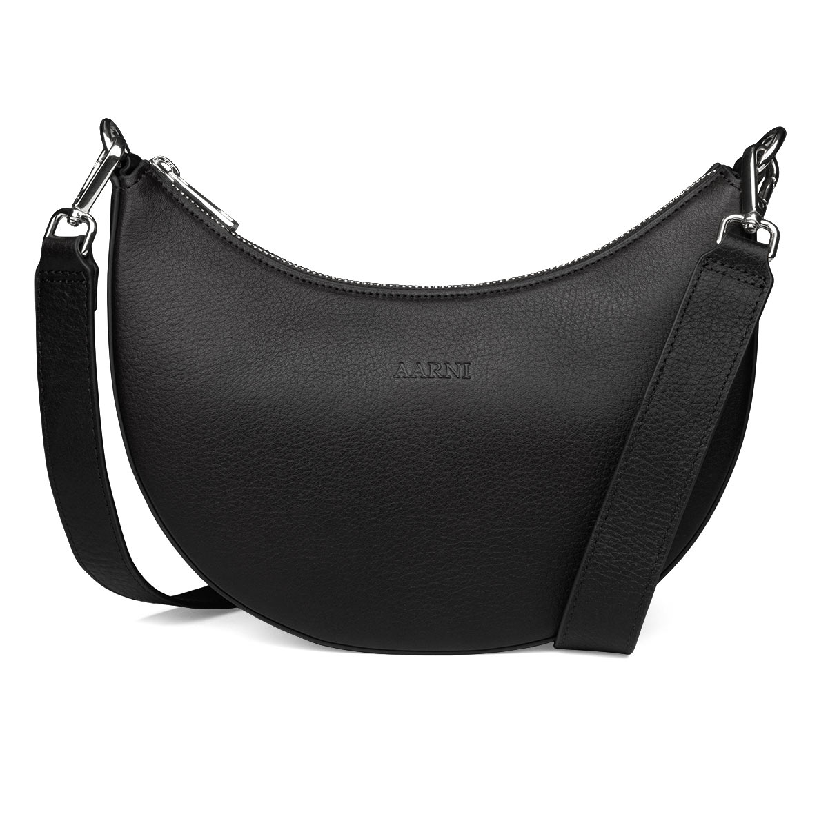 Aarni Luna underarm olkalaukku musta-kulta on näyttävä olkalaukku, joka mukautuu tyylikkäästi vartaloasi vasten. Laukku on valmistettu mustasta premium nahasta ja siinä on hopeanväriset metalliosat. Laukun mukana toimitetaan kaksiosainen nahkahihna. Tämä mahdollistaa laukun kantamisen crossbody tyylisenä tai vaihtoehtoisesti trendikkäästi underarm laukkuna. Laukun valmistukseen käytetty naudannahka on ruokatuotannon sivuvirtana syntynyttä ylijäämämateriaalia. Nahka on peräisin valikoiduilta tiloilta Suomesta ja Ruotsissa. Nahka värjätään ja parkitaan Alavetelissä Pohjanmaalla. Full Grain-naudannahka on vahvaa mutta silti taipuisaa, jonka vuoksi se mukautuu käytössä menettämättä muotoaan.