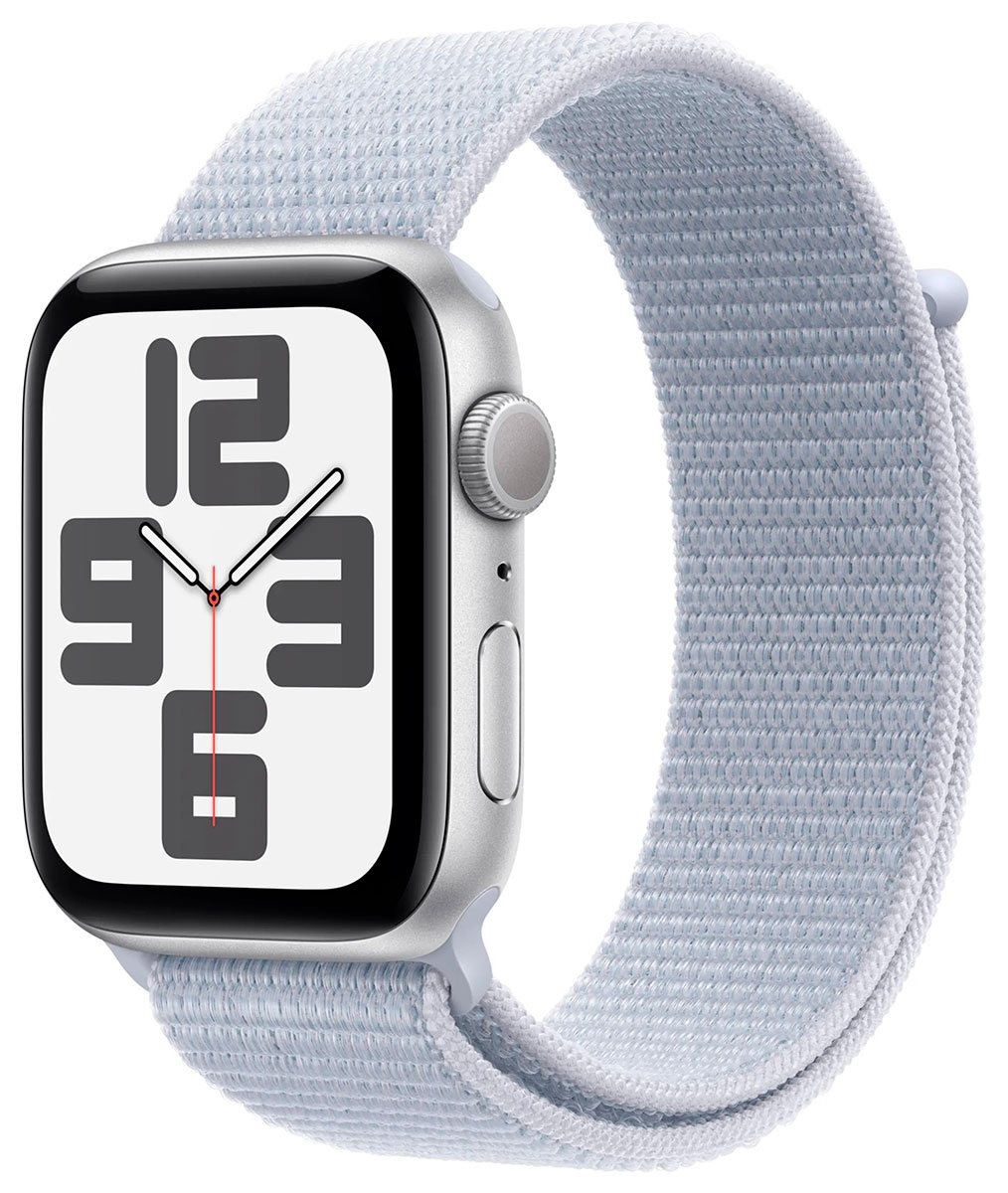 Pakkauksen sisältö: Apple Watch SE GPS hopeanvärinen alumiinikuori 44 mm vaalea urheiluranneke MXET3QN/A ja Apple Watchin magneettinen laturi–USB-C-johto. Apple Watchin mukana ei tule virtalähdettä.