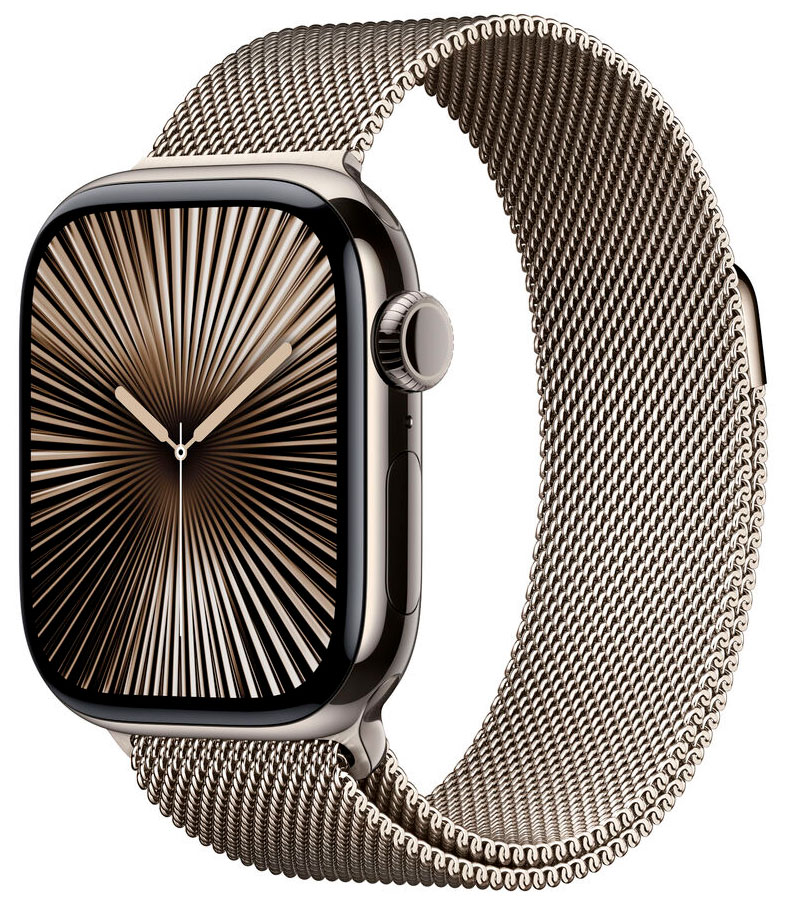 Pakkauksen sisältö: Apple Watch Series 10 GPS + Cellular 46mm Natural Titanium Case with Natural Milanese Loop MWYC3QN/A ja Apple Watchin magneettinen laturi–USB-C-johto (1 m). Apple Watchin mukana ei tule virta-lähdettä.