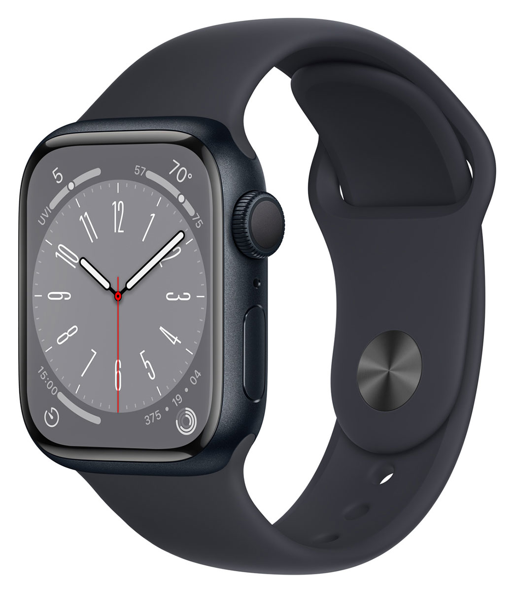 Apple Watch Series 8 on syksyllä 2022 julkaistu Apple Watch Seriesin uusin mallisto. Apple Watch Series 8 GPS keskiyönsininen alumiinikuori 45 mm keskiyö urheiluranneke -kellon 38 mm leveä ja 10,7 mm paksu alumiinikuori on valmistettu 100-prosenttisesti kierrätetystä lentokonealumiinista. Runkoon kiinnittyy fluoroelastomeerista valmistettu urheiluranneke, joka on paitsi kestävä myös yllättävän pehmeä. Rannekkeessa on innovatiivinen nastakiinnitys. Runkoon yhdistyy saumattomasti reunasta reunaan ulottuva aina päällä oleva Retina-näyttö, jonka kirkkaus on 1000 nitiä. Apple Watch Series 8 on lisäksi iskunkestävä, pölytiivis ja ja vedenpitävä aina 50 metriin saakka. Sykekello tarjoaa normaalissa käytössä noin 18 tuntia akunkestoa ja alhaisen virran tilassa jopa 36 tuntia.