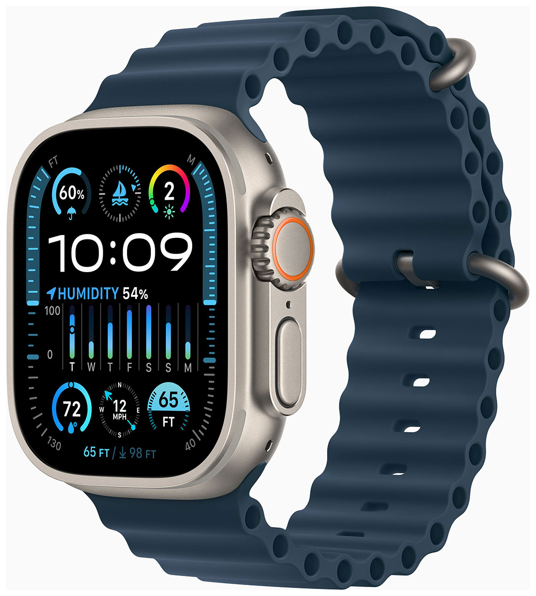 Apple Watch Ultra 2 -älykellon kevyt titaanikotelo on vankka ja korroosionkestävä, ja jonka korotettu muoto suojaa safiirilasia iskuilta. Sininen Ocean Band-ranneke on valmistettu joustavasta ja kestävästä elastomeerista, jonka pituus on 130 - 200 mm. Korroosionkestävä titaaninen solki ja säädettävä lenkki pitävät rannekkeen kiinni jopa nopeissa vesiurheilulajeissa.