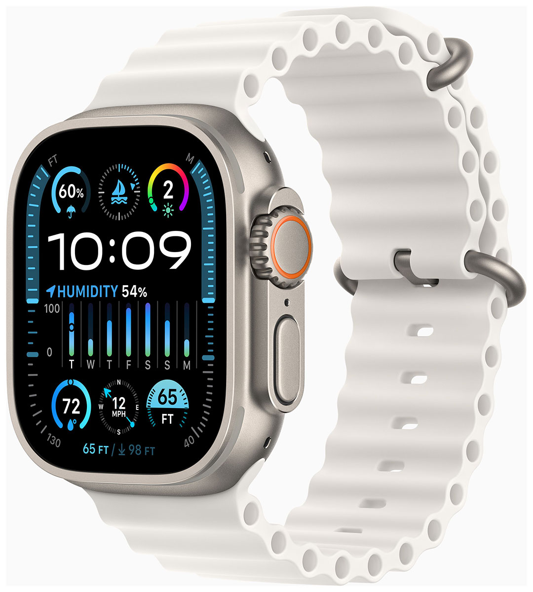 Apple Watch Ultra 2 -älykellon kevyt titaanikotelo on vankka ja korroosionkestävä, ja jonka korotettu muoto suojaa safiirilasia iskuilta. Valkoinen Ocean Band-ranneke on valmistettu joustavasta ja kestävästä elastomeerista, jonka pituus on 130 - 200 mm. Korroosionkestävä titaaninen solki ja säädettävä lenkki pitävät rannekkeen kiinni jopa nopeissa vesiurheilulajeissa.