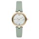 Amani ARIANNA AR11314 on kaunis mintunvihreä naisten kello pienellä rungolla ja suloisella helmiäisruutukuvioisella kellotaululla. Kellossa on ohuet osoittimet ja 1950-luvun ilmeen viimeistelee vetonupissa oleva pieni pyöröhiottu lasikoriste, cabochon. Armani-kelloilla on 2 vuoden takuu, ja ne toimitetaan valmistajan alkuperäisessä rasiassa.