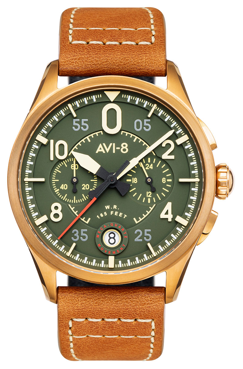 AVI-8 Spitfire Lock Chronograph Bronze Green AV-4089-02 on tyylikäs miesten pilottikello, joka on tribuutti hävittäjä-ässä Eric Lockille, joka lensi Spitfire-koneella toisessa maailmansodassa. Kellon 42 mm leveä ja 12 mm paksu pronssinvärinen runko on valmistettu ruostumattomasta teräksestä. Runkoon kiinnittyy kellanruskea nahkaranneke, jonka leveys kiinnityskohdasta on 22 mm. Mineraalilasin alla suojassa on vihreä kellotaulu, jossa ajanotto-ominaisuudet, 24 tunnin näyttö ja päivyri. AVI-8 Spitfire AV-4089-02 kuuluu vesitiiviysluokkaan 50m / 5atm eli se on rajoitetusti vesitiivis (uintia ei suositella). AVI-8-kelloille myönnetään kahden vuoden takuu. Saadaksesi takuun tulee kello rekisteröidä . AVI-8-rannekellot toimitetaan valmistajan alkuperäisessä pakkauksessa.