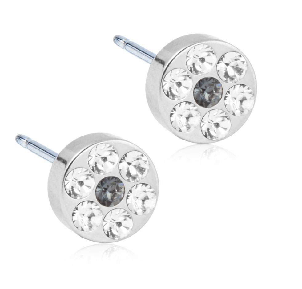 Blomdahl Brilliance Plenary Crystal/Black Diamond 5mm 15-12166-62 titaanikorvakoruja koristaa useat kauniit kirkkaat ja mustat kristallit, ja takaa löytyy tappikiinnike. Korvakorut valmistettu lääketieteellisestä titaanista, ja korun halkaisija on 5 mm. Blomdahl-korut toimitetaan valmistajan alkuperäisessä rasiassa.