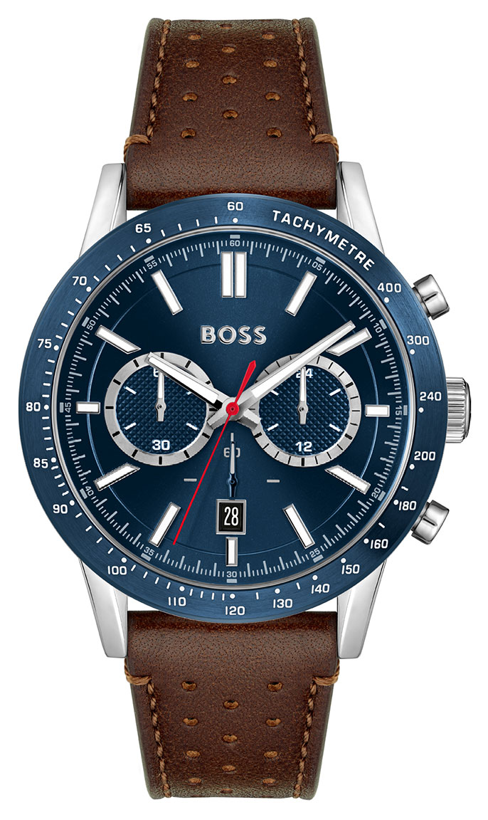 BOSS Allure 1513921 on tyylikäs miesten kello, jonka ruostumattomasta teräksestä valmistettu 44 mm leveä ja 11,4 mm paksu runko on hopeanvärinen. Rannekkeena tässä mallissa on ruskea nahkaranneke, jonka leveys kiinnityskohdasta on 22 mm. Kellon ominaisuuksiin kuuluu ajanotto ja päivyri. BOSS 1513921 -kellon sinistä kellotaulua suojaa mineraalilasi. Kello kuuluu vesitiiviysluokkaan 50m / 5atm eli se on rajoitetusti vesitiivis (uintia ei suositella). BOSS-kellot toimitetaan valmistajan alkuperäisessä pakkauksessa ja niillä on kahden vuoden takuu.