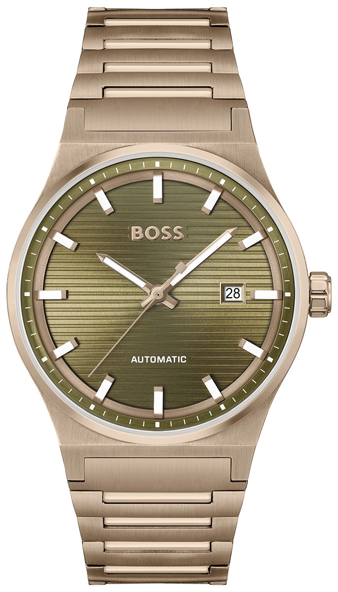 BOSS Candor Automatic 1514184 miesten rannekellossa on laadukas automaattikoneisto, jonka toimintaa voi seurata kellon takaosasta. Kellon runko on valmistettu ruostumattomasta teräksestä, joka on leveydeltään 41 mm ja paksuudeltaan 11,6 mm. Mineraalilasi suojaa kellotaulua, jossa on päivyri klo 3 kohdassa sekä luminoidut osoittimet ja indeksit, jotka helpottavat kellotaulun lukemista pimeässä. Kellossa on pronssinruskea teräsranneke, jonka leveys kiinnityskohdasta on 20 mm. BOSS Candor Automatic 1514184 kuuluu vesitiiviysluokkaan 50m / 5atm eli se on rajoitetusti vesitiivis (uintia ei suositella).