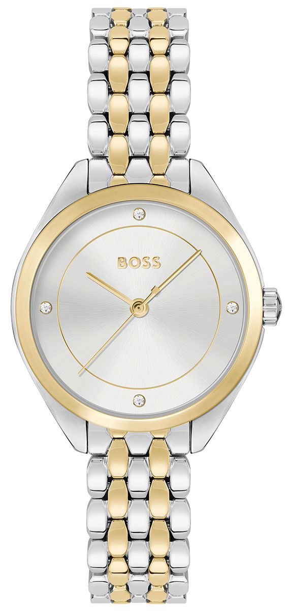 Boss Mae 1502724 -kello on näyttävä kaksivärinen kokonaisuus naisille. Kellon runko on 30 mm leveä tehden siitä varsin siron. Kellon hopeanväristä taulua suojaa kestävä mineraalilasi. Kellon ruostumattomasta teräksestä valmistetun rannekkeen leveys kiinnityskohdasta on 12 mm. Boss-kelloille myönnetään 2 vuoden takuu ja ne toimitetaan valmistajan alkuperäisessä pakkauksessa.