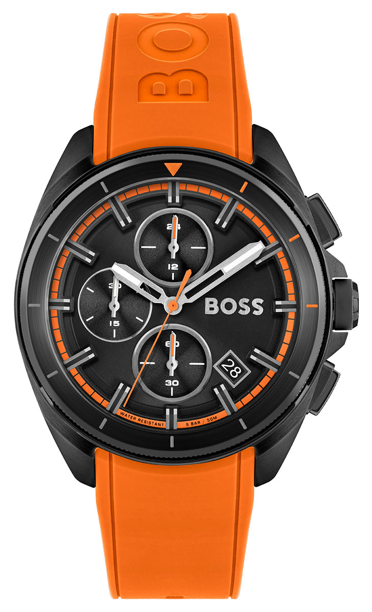 BOSS Volane 1513957 kronografikello sopeutuu monipuoliseen käyttöön niin urheilun parissa kuin arkipäivän riennoissa. Kellossa on ajanotto-ominaisuudet, luminoidut osoittimet ja indeksit, sekä päivyri näyttämässä nykyisen päivämäärän. Ruostumattomasta teräksestä valmistetun kellon leveys on 44 mm ja rungon paksuus 11,45 mm. Rannekkeena kellossa on oranssi silikoniranneke, jossa on BOSS-logo. Rannekkeen leveys kiinnityskohdasta on 22 mm ja pituus 160 - 210 mm. Kellotaulua suojaa naarmuuntumaton mineraalilasi. Kello kuuluu vesitiiviysluokkaan 50m / 5atm eli se on rajoitetusti vesitiivis (uintia ei suositella). BOSS -rannekellot toimitetaan valmistajan alkuperäisessä pakkauksessa ja niillä on kahden vuoden takuu.
