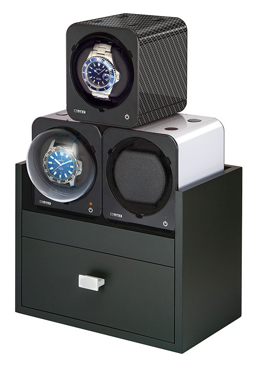 Boxy Center Small on lataustelakka jopa kuudelle Boxy Fancy Brick -moduulille. Boxy Fancy Brick -kellowinderit ovat modulaarisia eli ne ovat kätevästi kytkettävissä toisiinsa. Mustaksi lakatusta puusta valmistetun Boxy Center Small -telakan päällä on kahdeksan kontaktipintaa. Voit siis asettaa siihen vierekkäin kaksi Boxy Fancy Brick -moduulia ja molempien päälle vielä kaksi lisää. Telakka antaa siis virtansa jopa kuudelle winderille. Lisäksi telakassa on kellolaatikko, johon voit laittaa kolme kelloa säilöön. Tarvitset telakkaan Beco-adapterin. Takuu 1 vuosi.