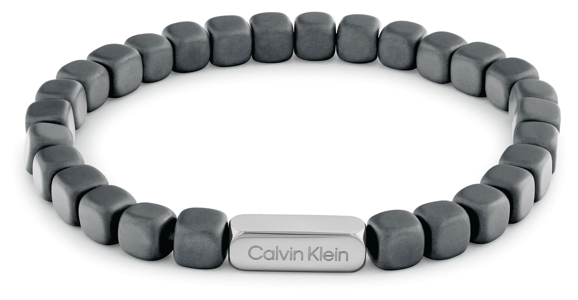 Calvin Klein Modern Square 35100060 on komea neliön muotoisista korukivistä valmistettu harmaa rannekoru, jossa on hopeanvärinen Calvin Klein logolla merkattu keskikohta. Korun sisäympärysmitta on 19,5 cm. Calvin Klein-korut toimitetaan valmistajan alkuperäisessä pakkauksessa.