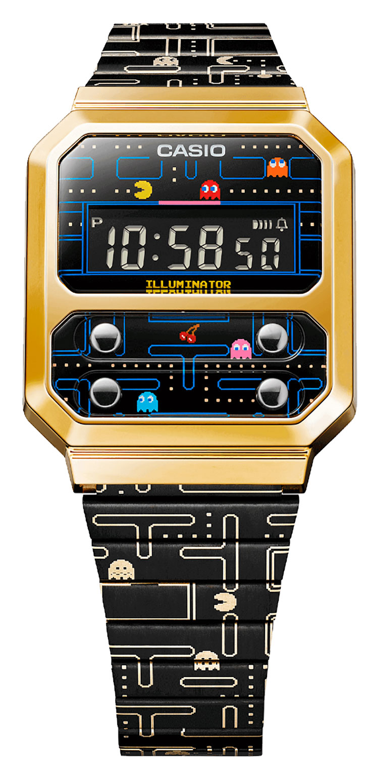 Casio A100WEPC-1BER PAC-MAN Limited Edition kello tuo 1980-luvun videopelimaskotin PacManin takaisin tässä hienossa retrotyyliä huokuvassa rannekellossa! Kellotaulussa on muotoiltuna kuvaksi käynnissä oleva PAC MAN -peli ja mustaan ionipinnoitettuun metallirannekkeeseen on tehty laserkaiverrus, joka muodostaa PacMan-peleistä tutut sokkelot. Alkuperäinen pelinäytön grafiikka on kaiverrettu rungon takaosaan. Pakkaus on suunniteltu herättämään klassinen arcade-tyyli läpikotaisin henkiin!