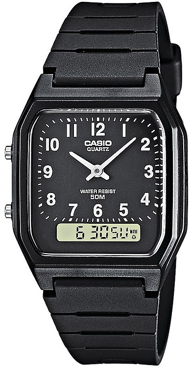 Perinteinen Casion ana-digi rannekello, Casio AW-48H-1BVEG. Kellossa on kaksoisaika, 12/24h näyttö, ajanotto/sekkari, hälytys, tasatuntisignaali ja kalenteri. Kellon rungon leveys 30mm ja paksuus 9mm. Casio kelloille myönnetään 2 vuoden takuu ja ne toimitetaan valmistajan alkuperäisessä rasiassa.