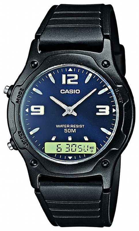 Perinteinen Casion ana-digi rannekello, Casio AW-49HE-2AVEG. Kellossa on kaksoisaika, 12/24h näyttö, ajanotto/sekkari, hälytys, tasatuntisignaali ja kalenteri. Kellon rungon leveys 37mm ja paksuus 10mm. Casio kelloille myönnetään 2 vuoden takuu ja ne toimitetaan valmistajan alkuperäisessä rasiassa.