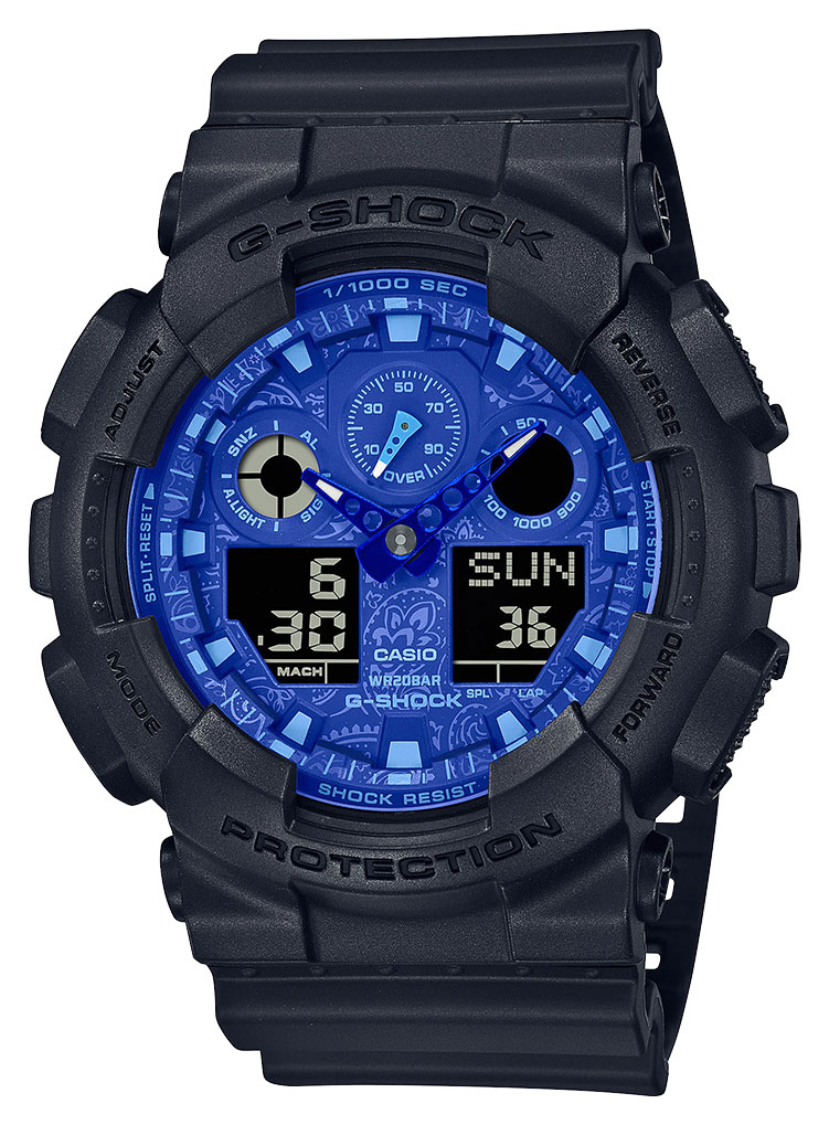 Casio Blue Paisley GA-100BP-1AER on Limited Edition -erikoismalli eli sitä on valmistettu ainoastaan rajoitettu määrä. Casio Blue Paisley Limited Edition GA-100BP-1AER on tyylikäs miesten rannekello, jonka mustan rungon leveys on 51,2 mm ja se on 16,9 mm paksu. Koko paino on 72 grammaa. Runkoon kiinnittyy musta polyuretaaniranneke. Mineraalilasi suojaa sinistä kellotaulua. Kellon vesitiiviys on 200m / 20atm, joten se on erikoisvesitiivis (soveltuu laitesukellukseen).