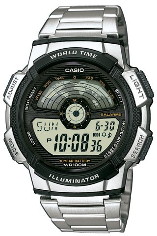 Casio Collection sarjan kello Casio Collection AE-1100WD-1. Kellossa on LED-valo, maailman aika, ajanotto/sekkari, ajastin, 5 hälytystä, kalenteri ja 12/24 tunnin näyttö. Kellon rungon leveys 44m, rannekkeen leveys 18mm ja vesitiiveys 100m. Casio kelloille myönnetään 2 vuoden takuu ja ne toimitetaan valmistajan alkuperäisessä rasiassa.