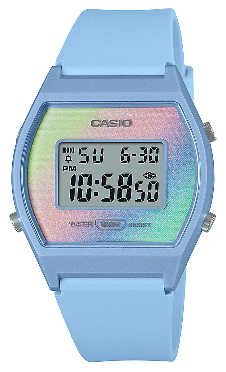 Casio Collection LW-205H-2AEFyhdistää Casion klassisen vintage-muodon moderneihin yksityiskohtiin. Kokonaisuus on sporttinen, monipuolinen ja helppo pukea urbaaniin tyyliin. LW-205H-8AEF-rannekellossa on taivaansininen runko ja ranneke, ja kehystä koristaa kimaltavat sateenkaaren värit. Casio kelloille myönnetään 2 vuoden takuu.
