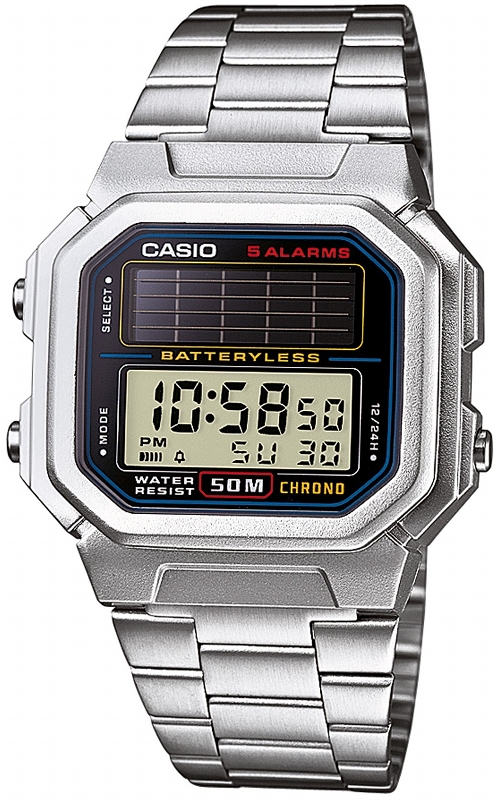Tyylikäs Casio Retrokello nyt todella edullisesti. Casio Collection sarjan Casio Solar Retro AL-190WD-1 on hauska ja muodikas kesäkello. Kellossa ei ole paristoa vaan se toimii kondensaattorilla, joka ottaa virtansa kellon aurinkokennosta. Kondensaattorin täysi varaus kestää noin 12 päivää. Kellossa 5 hälytystä, ajanotto ja kalenteri. Kellon rungon leveys 37mm, rannekkeen leveys 18mm. Casio kelloille myönnetään 2 vuoden takuu ja ne toimitetaan valmistajan alkuperäisessä rasiassa.