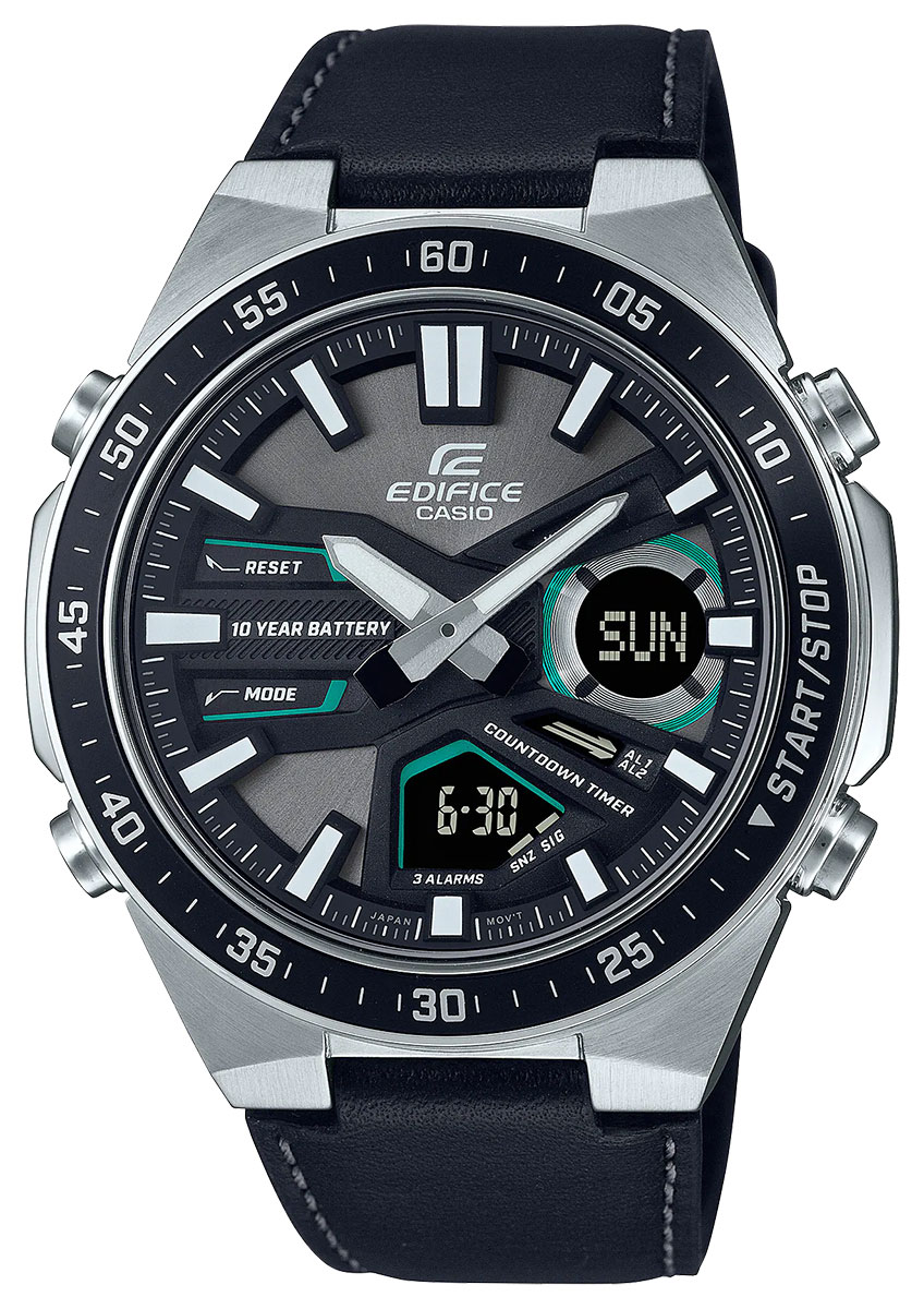 Casio Edifice EFV-C110L-1AVEF on tyylikäs miesten rannekello. Japanilaisen Casion suunnittelema ja valmistama kello kuuluu Casio Edifice -kellosarjaan. Casio Edifice Ana-Digi EFV-C110L-1AVEF -kellon hopeanvärisen rungon leveys on 46,9 mm ja se on 13,7 mm paksu. Koko paino on 166 grammaa. Runkoon kiinnittyy musta nahkaranneke. Mineraalilasi suojaa harmaata kellotaulua. Kellon vesitiiviys on 100m / 10atm eli soveltuu pintauintikäyttöön ja snorkkelisukellukseen, ei laitesukellukseen.