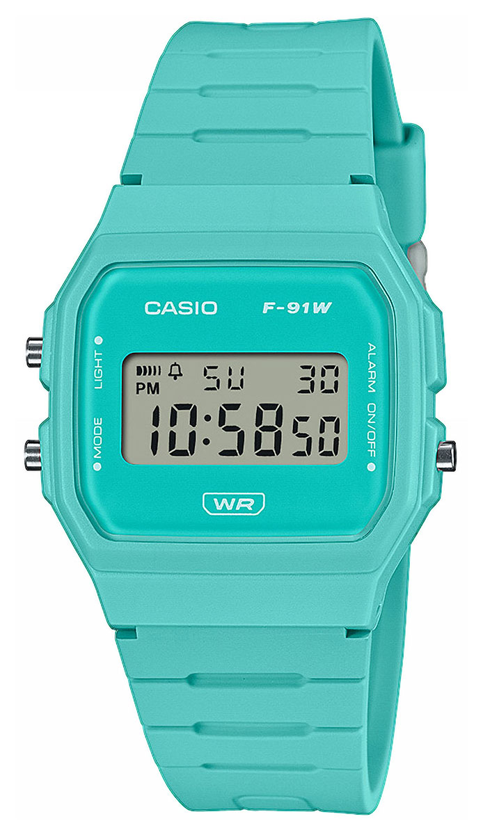 Casio F-91WB-2A2EF -digitaalikello kulkee helposti mukana sen ohuen ja kevyen koon vuoksi. Rungon leveys on 35,2 mm ja paksuus 8,5 mm, painaen kokonaisuudessaan vain 21 grammaa. Digitaalisella LCD-näytöllä varustetussa kellossa on päivämäärän/päivän näyttö, päivittäinen hälytys, tasatuntisignaali sekä sekuntikello. Kello on valmistettu ympäristöystävällisistä materiaaleista. Turkoosi runko on hartsia ja ranneke on valmistettu biopohjaisesta hartsista, jonka odotetaan vähentävän ympäristövaikutuksia. Casio F-91WB-2A2EF kuuluu vesitiiviysluokkaan 30 m / 3 atm, eli se on roiskevesitiivis.