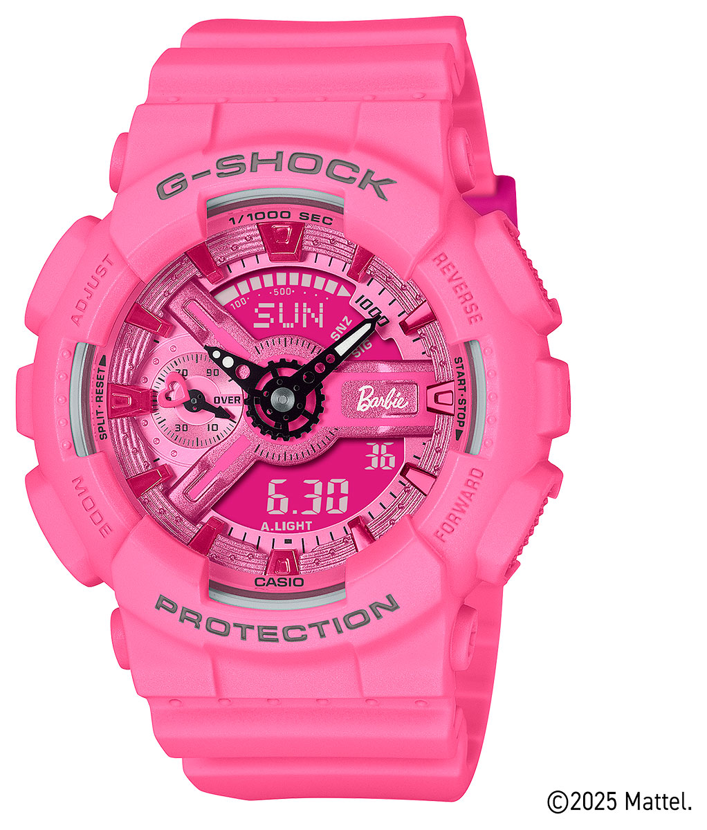 Casio G-Shock Barbie GMA-S110BE-4AER on Limited Edition -erikoismalli, joka on saanut innoituksensa maailmanlaajuisen Barbie-nuken lelusarjasta, joka lanseerattiin vuonna 1959. Kellossa on yksivärinen kirkkaan vaaleanpunainen pohja ja ranneke, jotka on korostettu Barbie™-logolla ja siluetilla. Kellossa on polyuretaaniranneke, joka on pituudeltaan 135 - 200 mm. Kevyeen, vain 56 g painavaan kelloon on saatu mahtumaan hulppea määrä toinen toistaan kätevämpiä ominaisuuksia, mm. harvinainen tuhannesosia mittaava sekuntikello, maailmanaika, hälytykset, kalenteri sekä 12/24h-, päivämäärä- ja viikonpäivänäytöt. Kello kuuluu vesitiiviysluokkaan 200m / 20atm, joten se soveltuu uintiin ja laitesukellukseen. Tätä hurmaavaa Barbie-kelloa on valmistettu ainoastaan rajoitettu määrä - hanki omasi nopeasti!