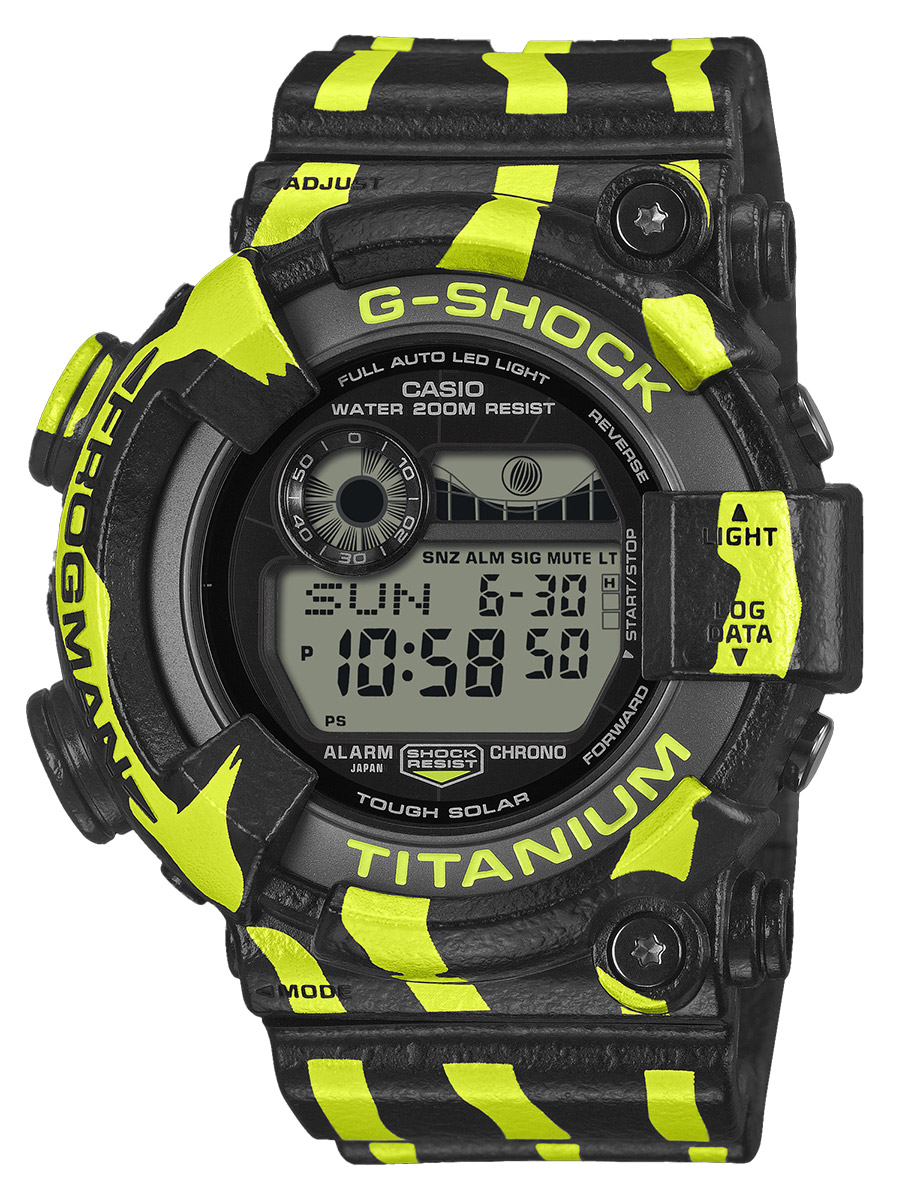 Casio G-SHOCK GW-8200TPF-1 FROGMAN on näyttävä ja rohkea sukeltajankello, joka on saanut inspiraationsa Etelä-Amerikan sademetsissä elävästä kolmiraitaisesta myrkkysammakosta. Tämä erikoismalli tulkitsee sammakon varoitusvärityksen ja sitkeyden voimakkaaksi vihreän ja mustan yhdistelmäksi, joka erottuu edukseen niin kuivalla maalla kuin veden alla.
