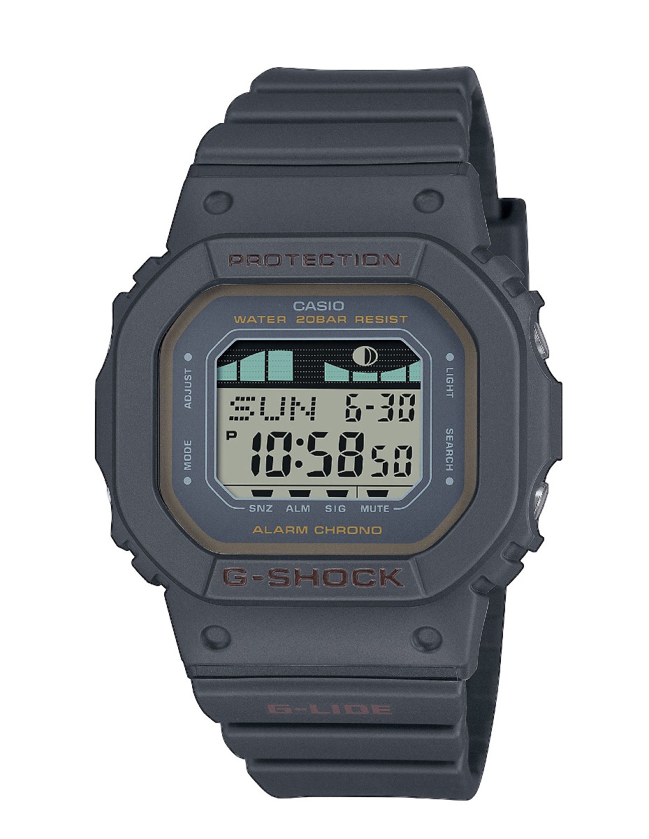 Casio G-Shock G-LIDE Beach Nostalgia GLX-S5600-1ER on iskunkestävä ja hyödyllinen kello kaikille vesiurheilun ystäville. Tämä värikäs surffikello antaa tietoa meriveden korkeuden vaihteluista, ja siinä on purjehdusajastin, iskunkestävä rakenne ja 29 aikavyöhykettä. Runko ja ranneke on ekologista biomuovia, mikä täyttää jokaisen vastuullisen kuluttajan standardit. Tämä urheilukello on vedenkestävä 200 metriin asti, ja itse kello painaa vain 41 g ja tuntuu siten erittäin mukavalta ranteessa. Digitaalinen ja urheilullinen kello sopii myös hyvin arkeen ja siinä on urheilullinen, huomiota herättävä ulkonäkö.