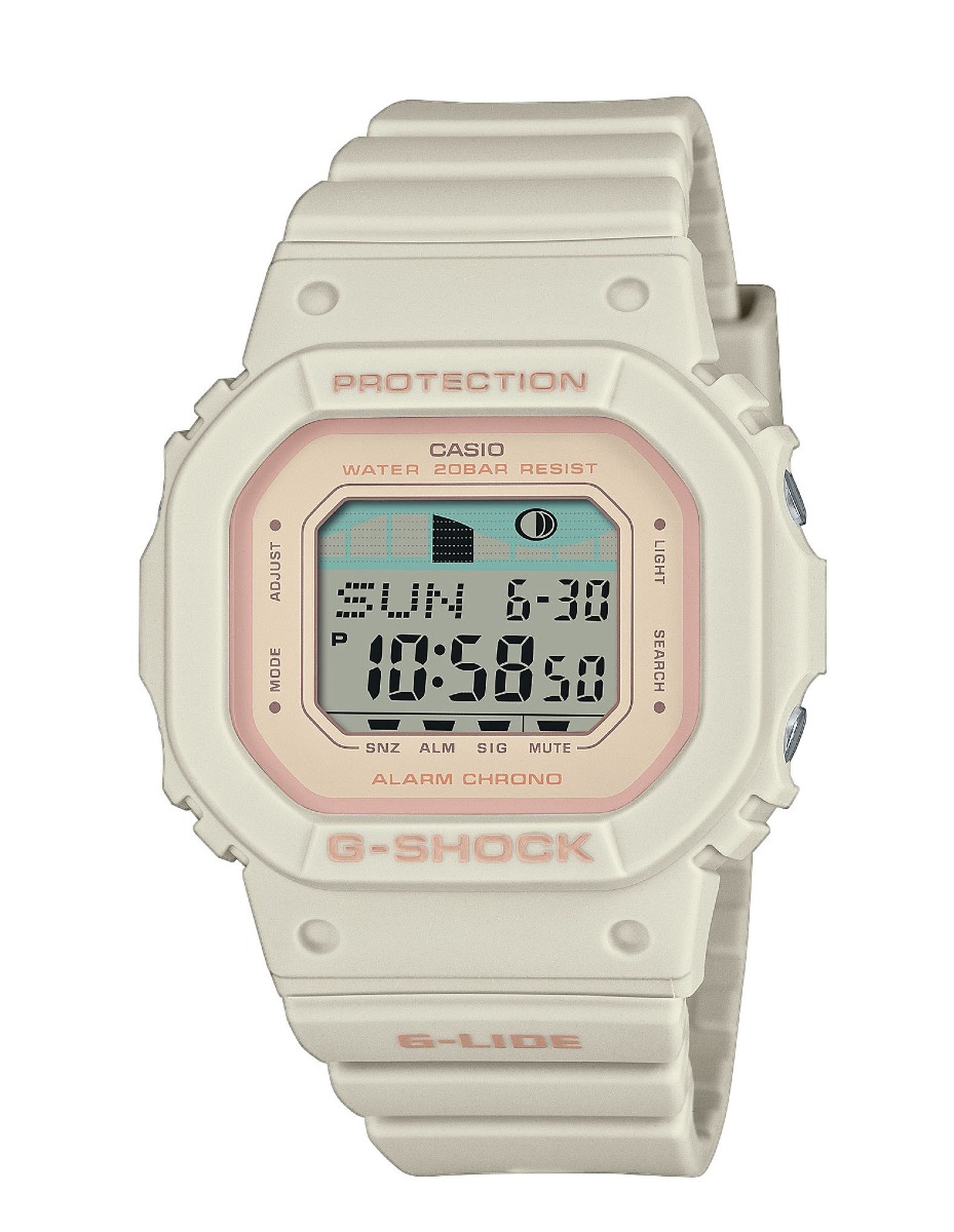 Casio Baby-G G-Lide BLX-565-2ER on iskunkestävä ja hyödyllinen kello kaikille vesiurheilun ystäville. Tämä värikäs surffikello antaa tietoa meriveden korkeuden vaihteluista, ja siinä on purjehdusajastin, iskunkestävä rakenne ja 29 aikavyöhykettä. Runko ja ranneke on ekologista biomuovia, mikä täyttää jokaisen vastuullisen kuluttajan standardit. Tämä urheilukello on vedenkestävä 200 metriin asti, ja itse kello painaa vain 41 g ja tuntuu siten erittäin mukavalta ranteessa. Digitaalinen ja urheilullinen kello sopii myös hyvin arkeen ja siinä on urheilullinen, huomiota herättävä ulkonäkö.