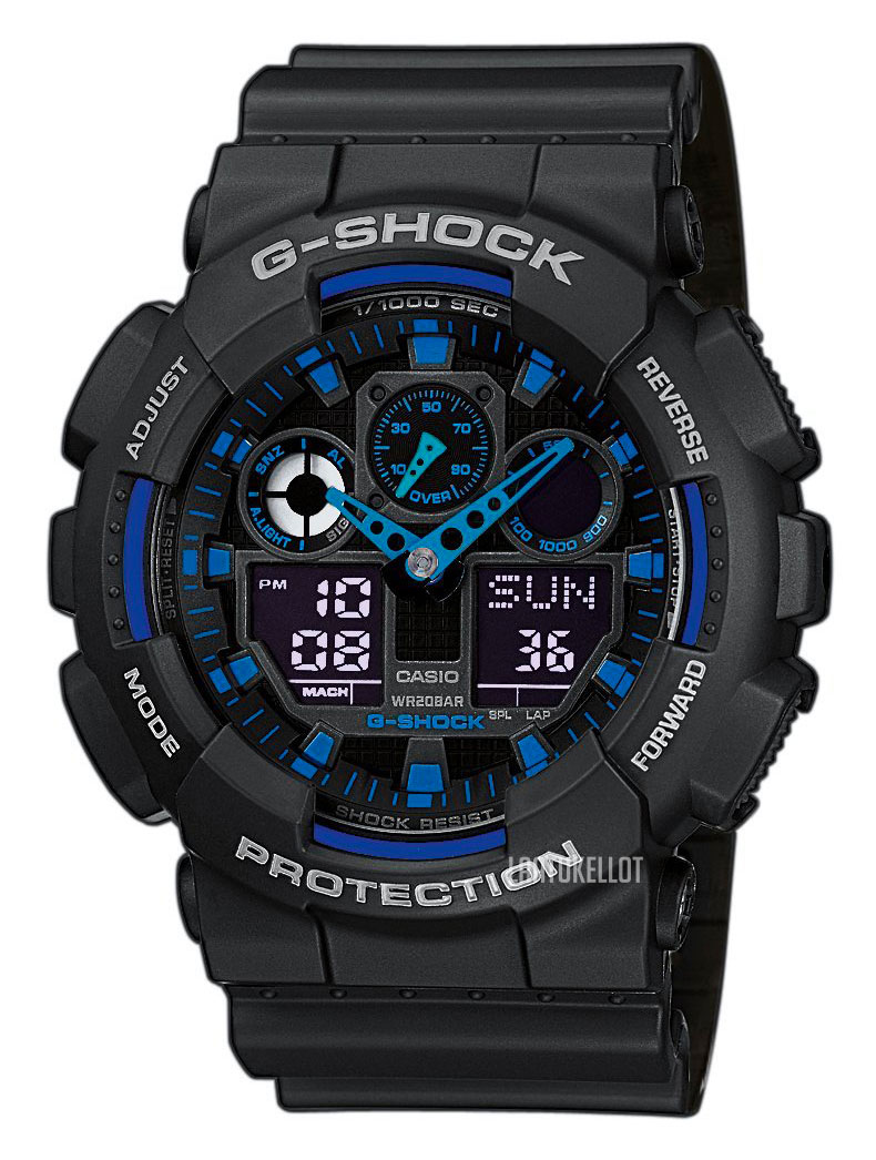 Casio G-Shock GA-100-1A2ER on erikoisiskunkestävä miesten kello. Kellon 51,2 mm leveä ja 16,9 mm paksu runko on valmistettu muovista. Paino on 88 grammaa. Mineraalilasi suojaa kellotaulua. Rannekkeena kellossa on musta muoviranneke, jonka leveys kiinnityskohdasta on 22 mm. Casio GA-100-1A2ER -kellon vesitiiviysluokka on 200 m / 20 atm eli se on erikoisvesitiivis (soveltuu laitesukellukseen). Casio-kelloille myönnetään 2 vuoden takuu ja ne toimitetaan valmistajan alkuperäisessä rasiassa.