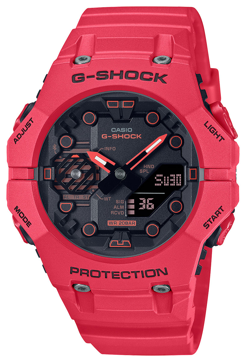 Casio G-Shock GA-B001-4AER on tyylikäs iskunkestävä rannekello. Japanilaisen Casion suunnittelema ja valmistama kello kuuluu Casio G-Shock -kellosarjaan. Casio G-Shock GA-B001-4AER -kellon punaisen rungon leveys on 46 mm ja se on 13,8 mm paksu. Koko paino on vain 51 grammaa. Kellossa on hiilikuituvahvistettu Carbon Core Guard -rakenne ja sen punainen ranneke on polyuretaania. Mineraaliilasi suojaa kellotaulua. Kellon vesitiiviys on 200m / 20atm, joten se on erikoisvesitiivis (soveltuu laitesukellukseen).