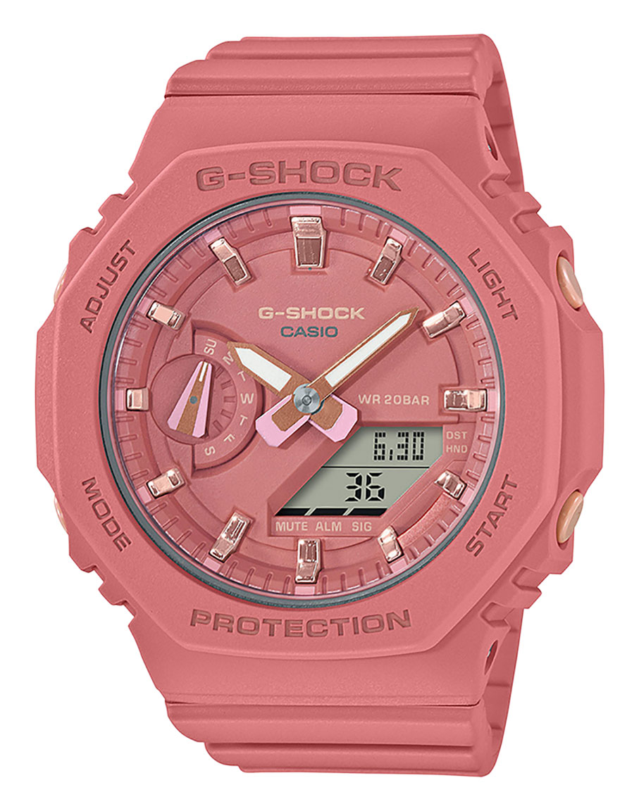 Casio G-Shock GMA-S2100-4A2ER on pienikokoisempi versio huippusuositusta GA-2100 sarjasta. Tässä lohenpunaisessa mallissa on tyyliä. G-Shock GMA-S2100-42AER -kellon 42,9 mm leveä ja 11,2 mm paksu runko ja ranneke on valmistettu polyuretaanista. Mineraalilasi suojaa kellotaulua. Kello on pakattu täyteen monipuolisia ominaisuuksia, jotka on listatu alla.