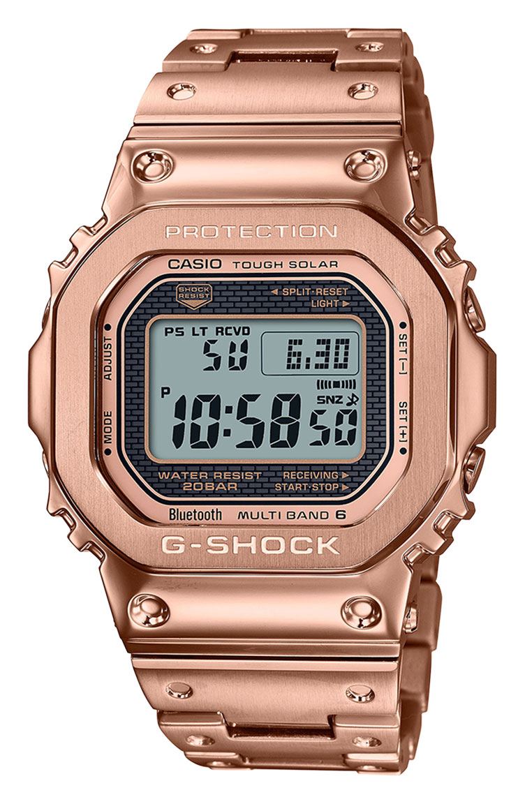 Casio G-Shock GMW-B5000GD-4ER Full Metal Rose Gold IP on tyylikkään näköinen G-Shock -kello. Casio G-Shock GMW-B5000GD-4ER Full Metal Rose Gold IP -kellon 43,2 mm leveä ja 13 mm paksu runko ja ranneke on valmistettu ruostumattomasta teräksestä, joka on IP-pinnoitettu punakullan väriseksi. Kellon paino on 167 grammaa. Mineraalilasi suojaa kellotaulua. Kello saa virtansa valosta, jolla se lataa akkuaan kellotaulussa olevan aurinkokennon kautta. Kello on iskunkestävä ja vesitiiviys on jopa 200 m / 20atm, joten se on erikoisvesitiivis (soveltuu laitesukellukseen).
