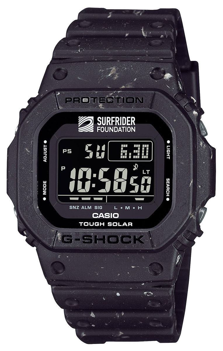 Casio G-Shock Limited Edition G-5600SRF-1ER digitaalikello on valmistettu yhteistyönä Surfrider Foundationin kanssa, joka työskentelee yhdessä valtamerelle sitoutuneiden surffaajien kanssa meriympäristön suojelemiseksi. Kellon materiaalit on saatu kierrätetystä uretaanista, jota käytetään kehyksessä ja rannekkeessa, mikä vähentää pois heitetyn hartsin ympäristövaikutuksia. Kellossa on erottuva hiutalekuviointi, joka syntyy sekoittamalla uudelleen käytettyä valkoista hartsia mustaan pohjaan, joka tekee jokaisesta kellosta ainutlaatuisen, antaen yksilöllisiä eroja kehyksen ja rannekkeen pinnalle.