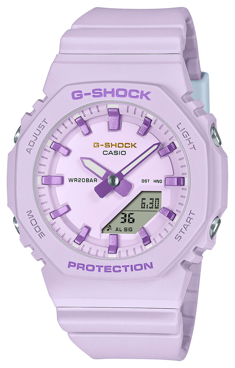 Casio G-Shock Limited Edition Womens day GMA-P2125W-6AER kansainvälistä naistenpäivää juhlistavassa kellossa kahdeksankulmainen kehys ja eloisa violetti yhdistyvät tyylikkään ja muodikkaan ilmeen luomiseksi. Metallisella höyrypinnoituksella viimeistellyt viisarit ja indeksit lisäävät kimaltelevaa hienoutta yksiväriseen muotoiluun.