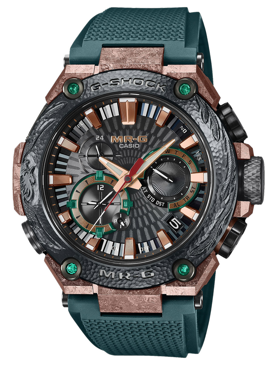 Casio G-Shock MRG-B2000KT-3A Limited Edition on poikkeuksellisen ylellinen rajoitetun erän G-SHOCK, jossa yhdistyvät huippuluokan teknologia ja perinteinen japanilainen metallitaide. Kellon keskiössä on upea, käsin kaiverrettu feeniks-lintu, joka kohoaa lentoon voimakkaana symbolina onnelle, jaloudelle, täydelliselle onnellisuudelle ja pitkälle iälle. Tämä myyttinen lintu on vuosisatojen ajan ollut arvostettu aihe japanilaisessa käsityöperinteessä.