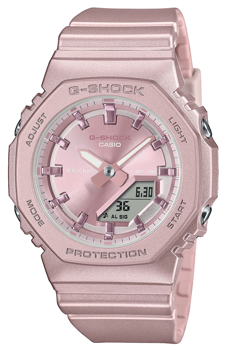 Casio G-Shock Small GMA-P2100ST-4AER kellotaulussa on kiiltävä, mattapintainen metalliväri lisäämässä kaunista kiiltoa minimalistiseen muotoiluun. Vaaleanpunaisen kehyksen ja rannekkeen tärkeimmät hartsikomponentit on valmistettu biopohjaisesta hartsista, joka koostuu uusiutuvista orgaanisista luonnonvaroista ja materiaaleista, joiden odotetaan auttavan vähentämään CO2-päästöjä ja vähentämään ympäristövaikutuksia.