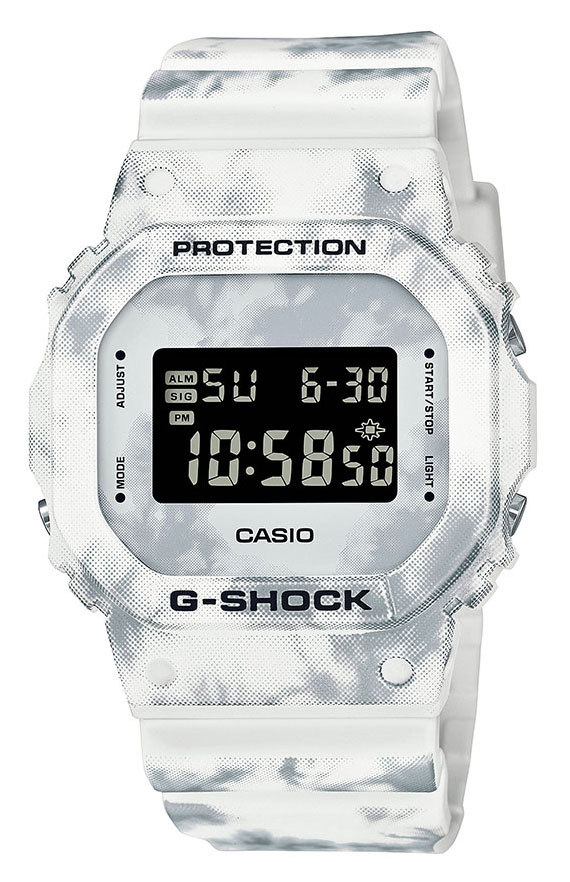 Casio G-Shock Snow Camouflage Limited Edition DW-5600GC-7ER -kellossa on LCD-kellotaulu, valkoharmaa muovirunko ja ranneke. Tämä kello on Limited Edition -erikoismalli ja sitä on valmistettu ainoastaan rajoitettu määrä. Pimeän tullessa näytön valaisee electroluminescent-taustavalo, ja näyttö valaistuu myös hälytyksen aikaan. Casio G-Shock DW-5600GC-7ER on iskunkestävä ja ranneke on erittäin kestävää ja ranteessa miellyttävää hartsia. Casio-kelloilla on kahden vuoden takuu, ja ne toimitetaan alkuperäisessä pakkauksessaan.
