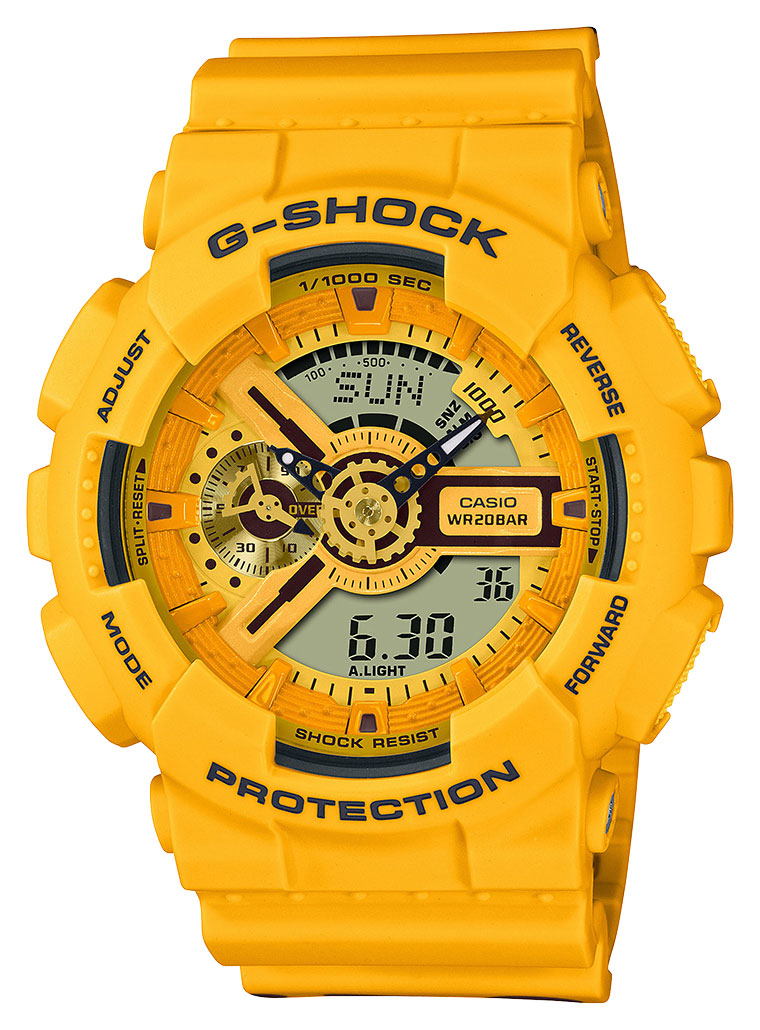 Casio G-Shock Summer Lovers Honey GA-110SLC-9AER on Limited Edition -erikoismalli ja sitä on valmistettu ainoastaan rajoitettu määrä. Casio G-Shock Summer Lovers Honey Limited Edition GA-110SLC-9AER on tyylikäs iskunkestävä rannekello. Japanilaisen Casion suunnittelema ja valmistama kello kuuluu Casio G-Shock -kellosarjaan. Casio G-Shock GA-110SLC-9AER -kellon keltaisen rungon leveys on 51,2 mm ja se on 16,9 mm paksu. Koko paino on vain 72 grammaa. Kellossa on hiilikuituvahvistettu Carbon Core Guard -rakenne ja sen keltainen ranneke on polyuretaania. Mineraaliilasi suojaa digitaalista kellotaulua. Kellon vesitiiviys on 200m / 20atm, joten se on erikoisvesitiivis (soveltuu laitesukellukseen).