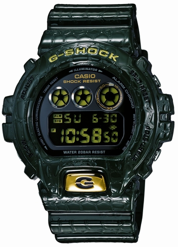 Casio G-Shock sarjan erikoisiskunkestävä kello Casio G-Shock Crocodile DW-6900CR-3. Kellon muovirunkoon ja rannekkeeseen on painatettu krokotiilin nahkaa jäljittelevä kuviointi. Kellossa illuminator taustavalo, villkuhälytys, ajanotto/sekkari 1/100s-24hr, ajastin, kalenteri, multihälytys, tasatuntisignaali ja 12/24h näyttö. Kellon rungon leveys 50mm, rannekkeen leveys 22mm ja vesitiiveys 200m. Casio kelloille myönnetään 2 vuoden takuu. Tuote toimitetaan valmistajan alkuperäisessä rasiassa postikuluitta.