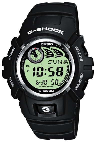 Casio G-Shock erikoisiskunkestävä rannekello. Kellossa on joustava polyuretaaniranneke, jonka leveys on 20mm. Rungon leveys 47mm. Kellossa automaattinen illuminator taustavalo, muisti web- ja e-mail osoitteille (salasana suojattu), torkkuherätys, kalenteri, maailmanaika, 12/24 tunnin näyttö, ajastin, ajanotto/sekkari (1 tunti) ja 5 hälytystä, jotka voidaan asettaa päivä tai viikko kohtaiseksi. Casio kelloille myönnetään 2 vuoden takuu ja ne toimitetaan valmistajan alkuperäisessä rasiassa.