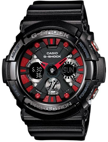 Casio G-Shock sarjan erikoisiskunkestävä kello Casio G-Shock GA-200SH-1A, jossa hienoja punaisia yksityiskohtia. Kellossa automaattinen LED-taustavalo, maailmanaika, ajanotto/sekkari 1/1000s-100hr, ajastin, torkkuherätys, hälytys 5kpl, tasatuntisignaali, kalenteri ja 12/24h näyttö. Kellon rungon leveys on 52mm. Polyuretaanirannekkeen leveys 22mm ja kellon vesitiiveys on 200m. Casio kelloille myönnetään 2 vuoden takuu. Tuote toimitetaan valmistajan alkuperäisessä rasiassa.