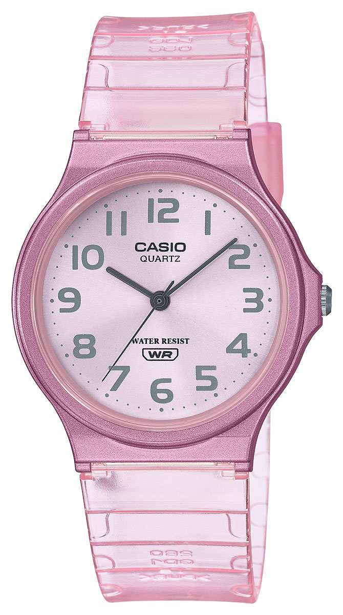 Kesä on täydellistä aikaa värikkäille kelloille. Casio MQ-24S-4BEF on Casion uusi värikäs yksiväristen kellojen kellomallisto, jonka pastellinsävyiset kellot piristävät kesäistä asuasi. Kellon ranneke on läpinäkyvää hartsia, joka tuntuu miellyttävältä ranteessa, ja taulussa on suuret indeksit. Jätä kännykkä huoletta taskuun tai laukkuun, ja nauti huolettomuudesta. Vaaleanpunaisessa Casio MQ-24S-4BEF-naisten rannekellossa on 35 mm leveä runko ja 2 vuoden paristonkesto. Kello toimitetaan Casion alkuperäisessä rasiassa.