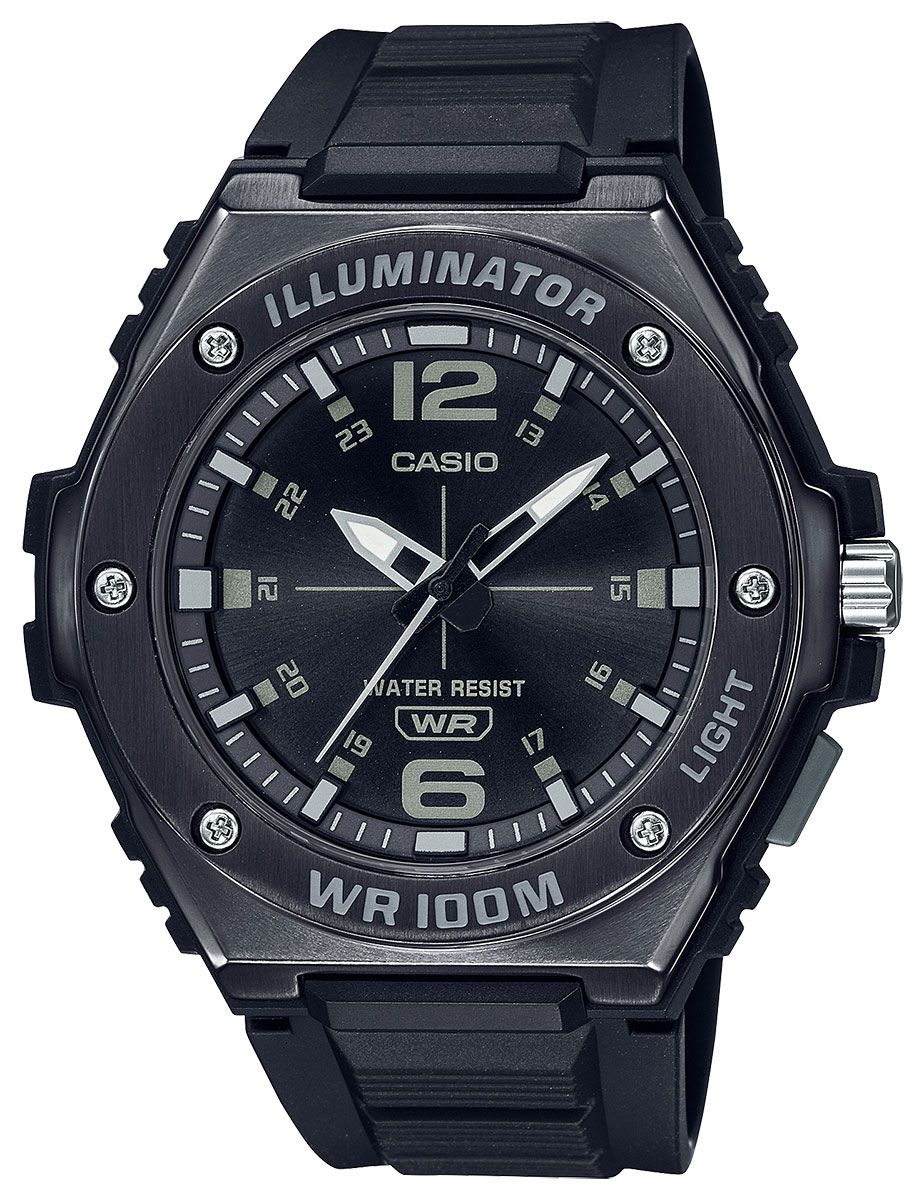 Casio MWA-100HB-1AVEF on täydellinen valinta sporttista kelloa etsivälle. Tämä täysin musta miesten rannekello on varustettu ruuvikiinnitteisellä teräksisellä bezelillä, mikä antaa kellolle huomioitaherättävän ilmeen. Musta panerai-tyyppinen taulu, jossa on suuret indeksit kello 12 ja kuuden kohdalla, on helppolukuinen. Erillinen numerointi löytyy sisäkehästä, mikä helpottaa kellon lukemista edelleen. Illuminator-valo helpottaa kellonajan lukemista pimeässä. Casio MWA-100HB-1AVEF on täydellinen valinta arkikelloksi, ja sillä on 100 metrin vedenkestävyys sekä kolmen vuoden paristonkesto. Ranneke on mustaa muovia. Casio MWA-100HB-1AVEF miesten kello toimitetaan valmistajan alkuperäisessä rasiassa, ja sillä on kahden vuoden takuu.