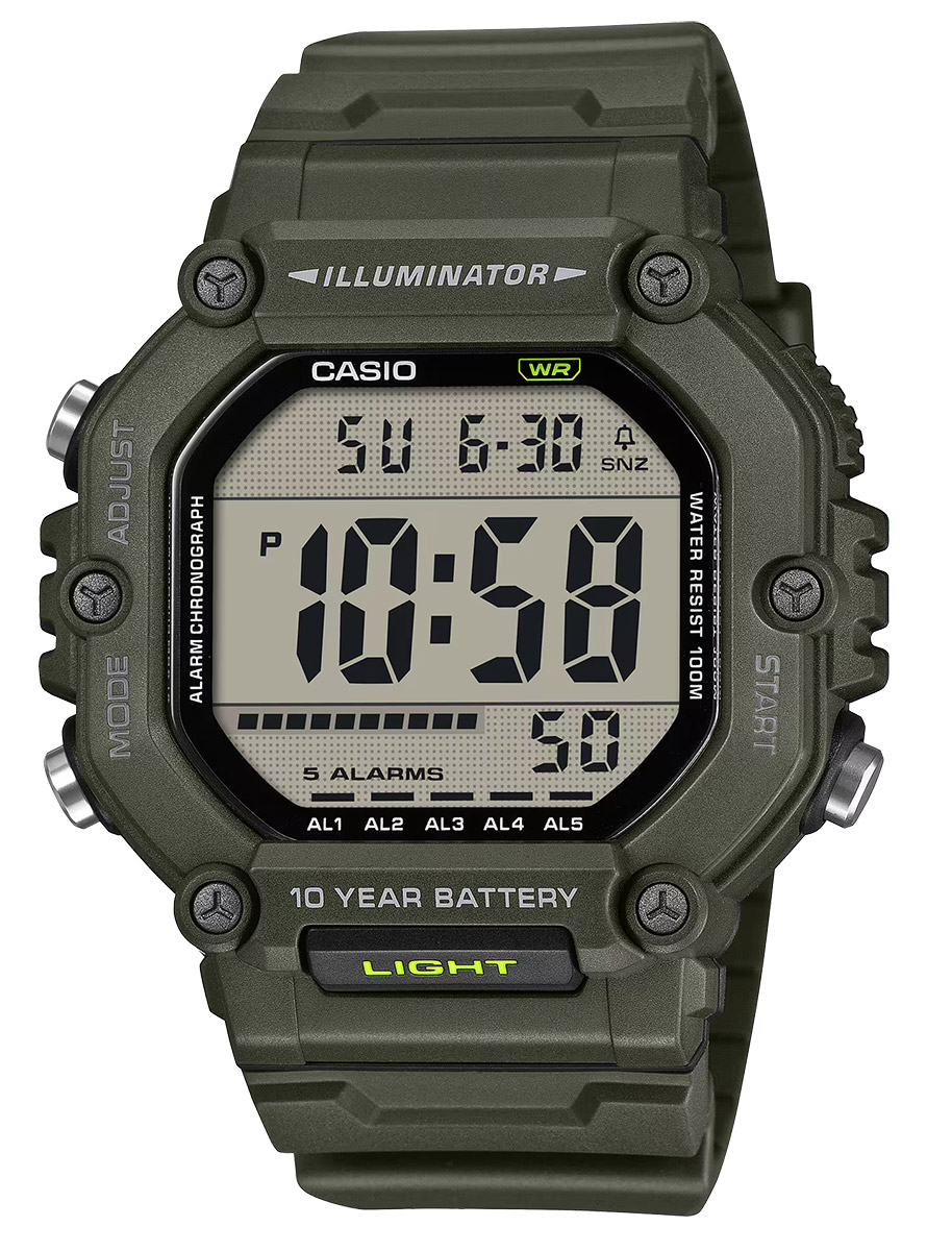 Casio AE-1600HX-3AVEF on kello sinulle, joka vaadit varusteiltasi kestävyyttä ja selkeyttä. Tämä tumman oliivinvihreä "Heavy Duty" -malli yhdistää kookkaan, maskuliinisen muotoilun ja erinomaisen luettavuuden. Suuri LCD-näyttö ja keltaiset yksityiskohdat tekevät tietojen tarkistamisesta vaivatonta kovassakin menossa, olitpa sitten työmaalla, vaelluksella tai kuntosalilla.