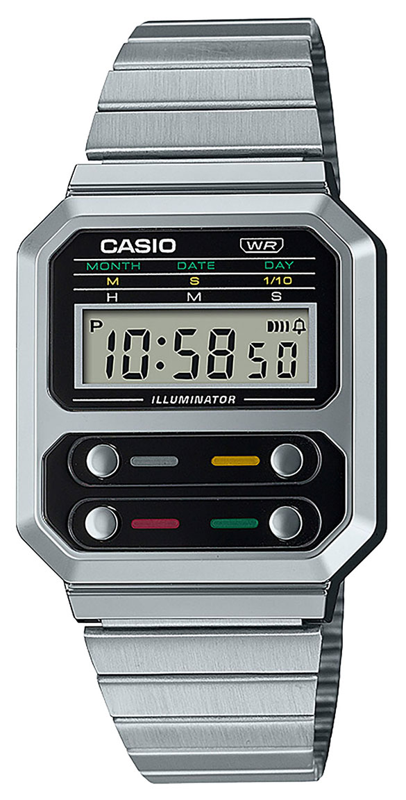Casio Vintage F100 Revival A100WE-1AEF on tyylikkään näköinen miesten kello. Casio A100WE-1AEF -kellon 32,7 mm leveä ja 9,2 mm paksu runko on valmistettu muovista. Kellon paino on 53 grammaa. Muovilasi suojaa kellotaulua. Rannekkeena kellossa on hopeanvärinen teräsranneke, jonka leveys kiinnityskohdasta on 21 mm. Kellon vesitiiviysluokka on 30 m / 3atm eli se on roiskevesitiivis.