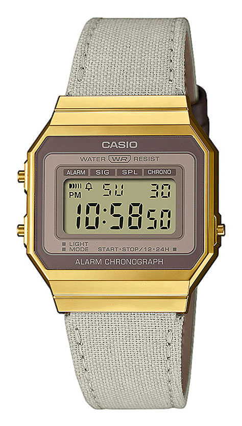 Casio Vintage A700WEGL-7AEF -rannekellossa on retroilme ja miellyttävä leveä kellotaulu, josta on helppo lukea aikaa. Rungon koko on 35,5mm x 37,4mm x 6 mm (leveys x korkeus x syvyys). Runko on valmistettu kullanvärisestä ruostumattomasta teräksestä ja ranneke on tekstiiliä. Kellossa on akryylilasi.