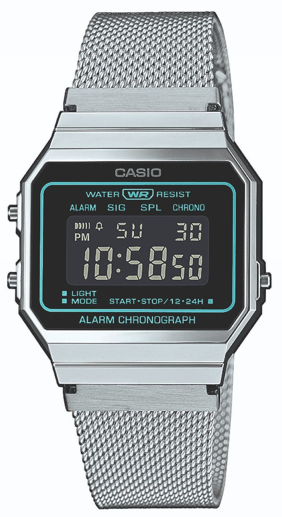 Casio Vintage Iconic A700WEMS-1BEF on loistava valinta kaikille, jotka rakastavat retrokelloja. Tässä tyylikkäässä digitaalikellossa on hopeinen runko ja milanaise-ranneke, joka antaa kellolle hienostuneisuutta. Kellossa on hyvin erottuva negatiivinen LCD-näyttö, joka on koristeltu kirkkailla turkooseilla yksityiskohdilla. Toimintoihin kuuluvat hälytys, kalenteri ja sekuntikello. Casio Vintage Iconic A700WEMS-1BEF -digitaalikellolla on 2 vuoden takuu.