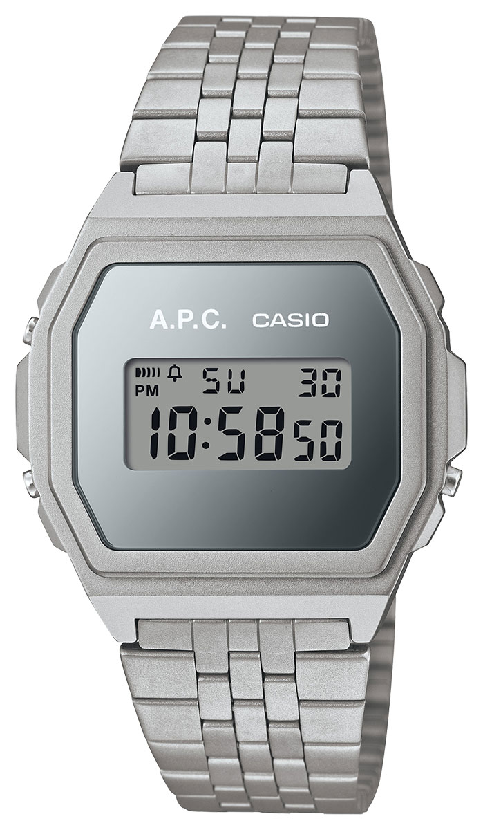 Casio Vintage Iconic Limited Edition A1000ACD-7ER rajoitetun erän unisex digitaalikello on tehty yhteistyönä maailmanlaajuisen ranskalaisen merkin A.P.C:n ja Casion kanssa, erottuen 70-luvun vintage-suunnittelullaan, ohuella ja tyylikkäällä kahdeksankulmaisella rungolla, jossa yhdistyvät muoti ja toiminnallisuus. Runko on leveydeltään 38 mm ja paksuudeltaan vain 7,3 mm. Hopeanvärinen ranneke on valmistettu ruostumattomasta teräksestä ja se sopii ympärysmitaltaan 150 - 205 mm ranteisiin. Useiden toimintojen, kuten hälytyksen, sekuntikellon ja LED-valon ansiosta, tämä kello on sekä toimiva että hienostunut. Kellossa on 3 vuoden pariston kesto ja se on roiskevesitiivis. Erikoislaatikkoon pakattu digitaalikello toimii erinomaisesti myös lahjana.
