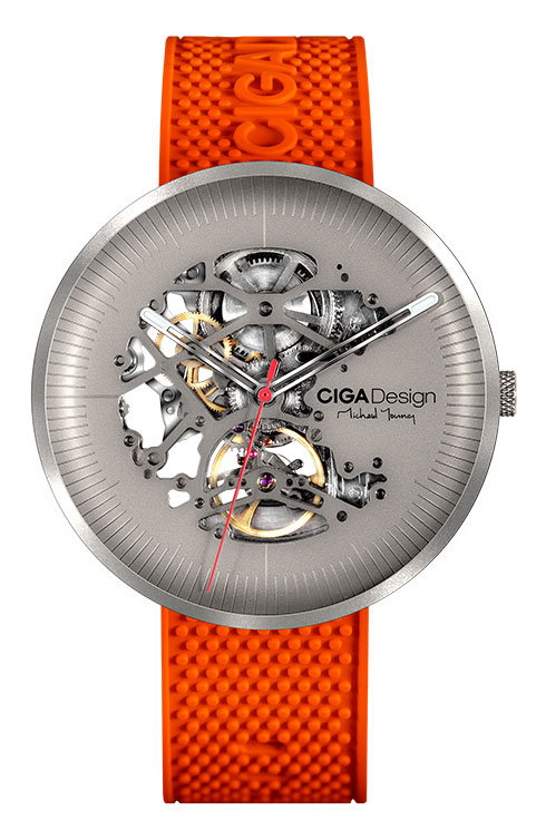 CIGA Design MY Series Titanium Automatic Skeleton M031-TITI-W15OG on tyylikäs luurankokello automaattikoneistolla. Muotoilija Michael Young käsialaa, tämän titaanikellon 41 mm leveä ja 12 mm paksu runko on valmistettu hopeanvärisestä titaanista. Materiaalina titaani on paitsi erittäin kestävää, se on myös hyvin kevyttä, jonka vuoksi tämä kello on erittäin miellyttävä ranteessa. Pakkauksessa toimitetaan irrallisena kaksi ranneketta (kumpikaan ei rungossa kiinni): oranssi silikoniranneke (145 - 230 mm) ja musta krokotiliikuvioitu nahkaranneke (160 - 215 mm). Koneistona kellossa on 25-kivinen SEAGULL ST2551JK Automatic 40 tunnin käyntivaralla. Skeleton-kellotaulun suojana on safiirilasi, jonka läpi voit ihastella kellon koneiston toimintaa, ja myös takalasi on avonainen tehden tästä kellosta täysin läpikuultavan. Luettavuuden parantamiseksi kellon viisarien päät on luminoitu. Kello kuuluu 3 ATM -vesitiiviysluokkaan, eli se on roiskevesitiivis. CIGA Design -kelloille myönnetään yhden vuoden takuu, ja ne toimitetaan valmistajan alkuperäisissä pakkauksissa.